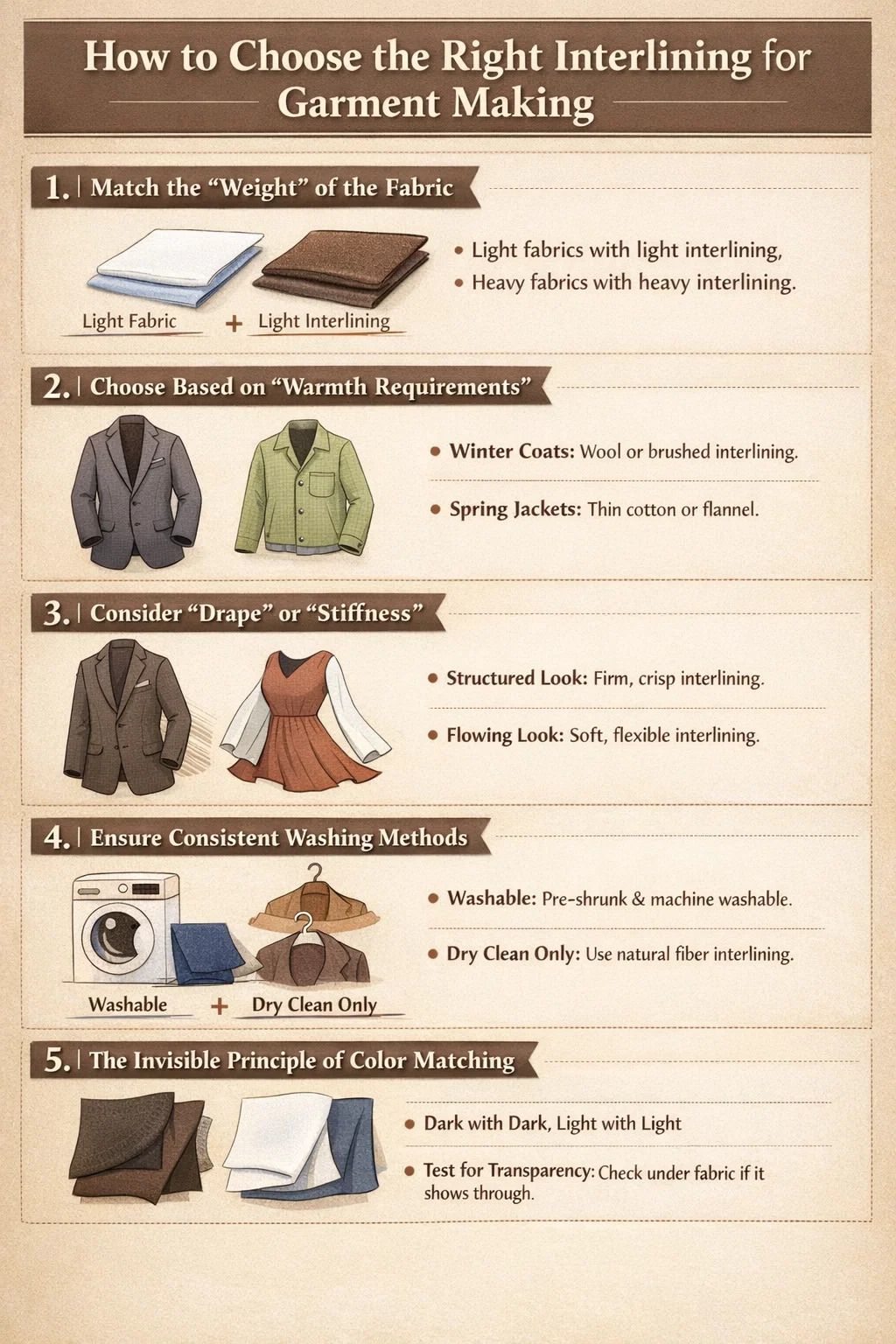 I beklædningsfremstilling, at vælge det rigtige interlining er et afgørende skridt i at bestemme tekstur og levetid for det færdige tøj. Når du vælger interlining, kan du henvise til følgende enkle og praktiske principper: