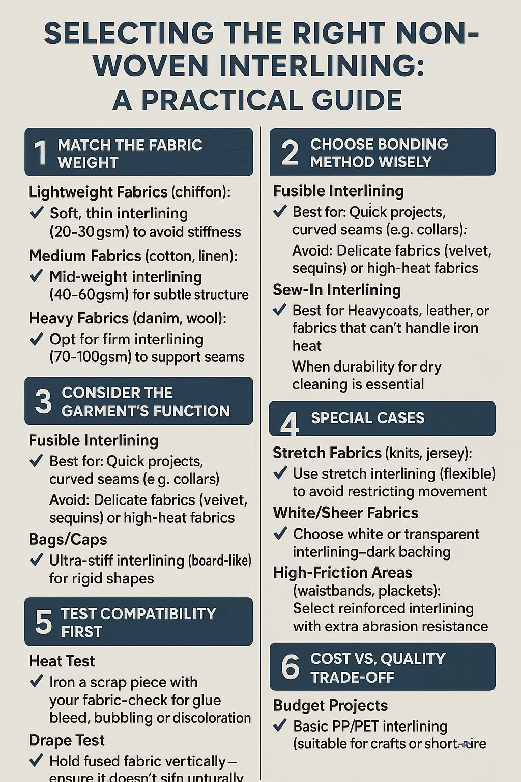 Tunge stoffer (denim, uld): vælg fast interlining (70-100 gsm) til understøttelse af sømme og kanter.