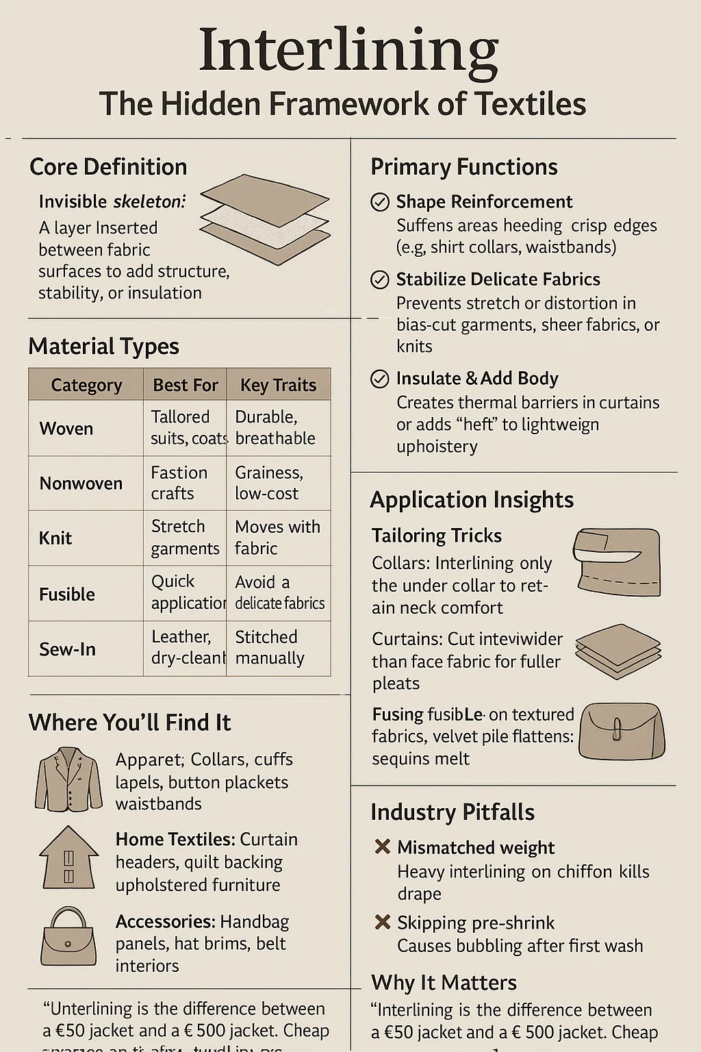"Interlining er forskellen mellem en jakke på € 50 og en jakke på € 500. Billige versioner knækker efter renseri; luksustyper overlever det ydre stof." - skræddersyet skrædder, Milan