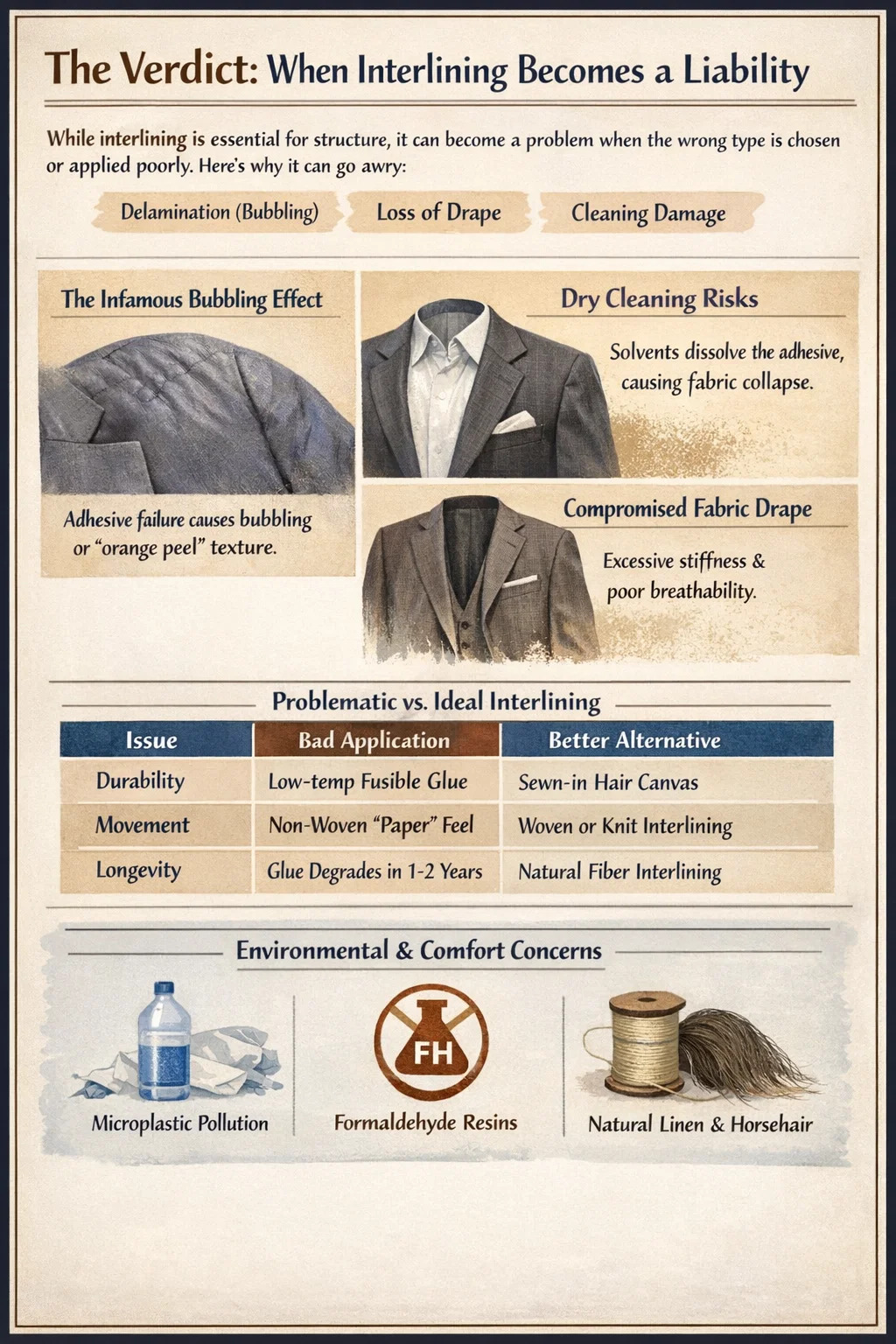 Moderne fast fashion er stærkt afhængig af syntetisk mellemfor , som introducerer en højt mikroplastisk fodaftryk . Fordi disse lag er bundet med harpiks og lim, gør de tøjet næsten umuligt at genbruge. Desuden billigt interlining bruger ofte formaldehyd-baserede harpikser under fremstillingsprocessen, hvilket kan forårsage hudirritation for dem med kemisk følsomhed. For at undgå disse "dårlige" resultater er mange avancerede skræddere vendt tilbage til naturligt linned eller hestehår lag, der giver struktur uden de kemiske ulemper.